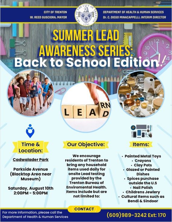 TRENTON, NJ -- The City of Trenton Department of Health and Human Services is excited to announce the Summer Lead Awareness Series: Back to School Edition, a community event aimed at raising awareness about the risks of lead exposure as families prepare for the upcoming school year. The event will take place on Saturday, August 10, from 2:00 p.m. to 5:00 p.m. at Cadwalader Park in the Blacktop Area near the Museum.