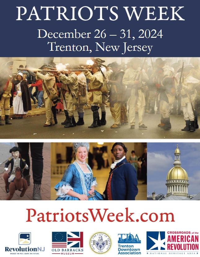 Patriots Week 2024 is presented by a coalition of local and State heritage partners in partnership with the Old Barracks Museum, the City of Trenton, Crossroads of the American Revolution, RevNJ, and the Trenton Downtown Association (TDA).