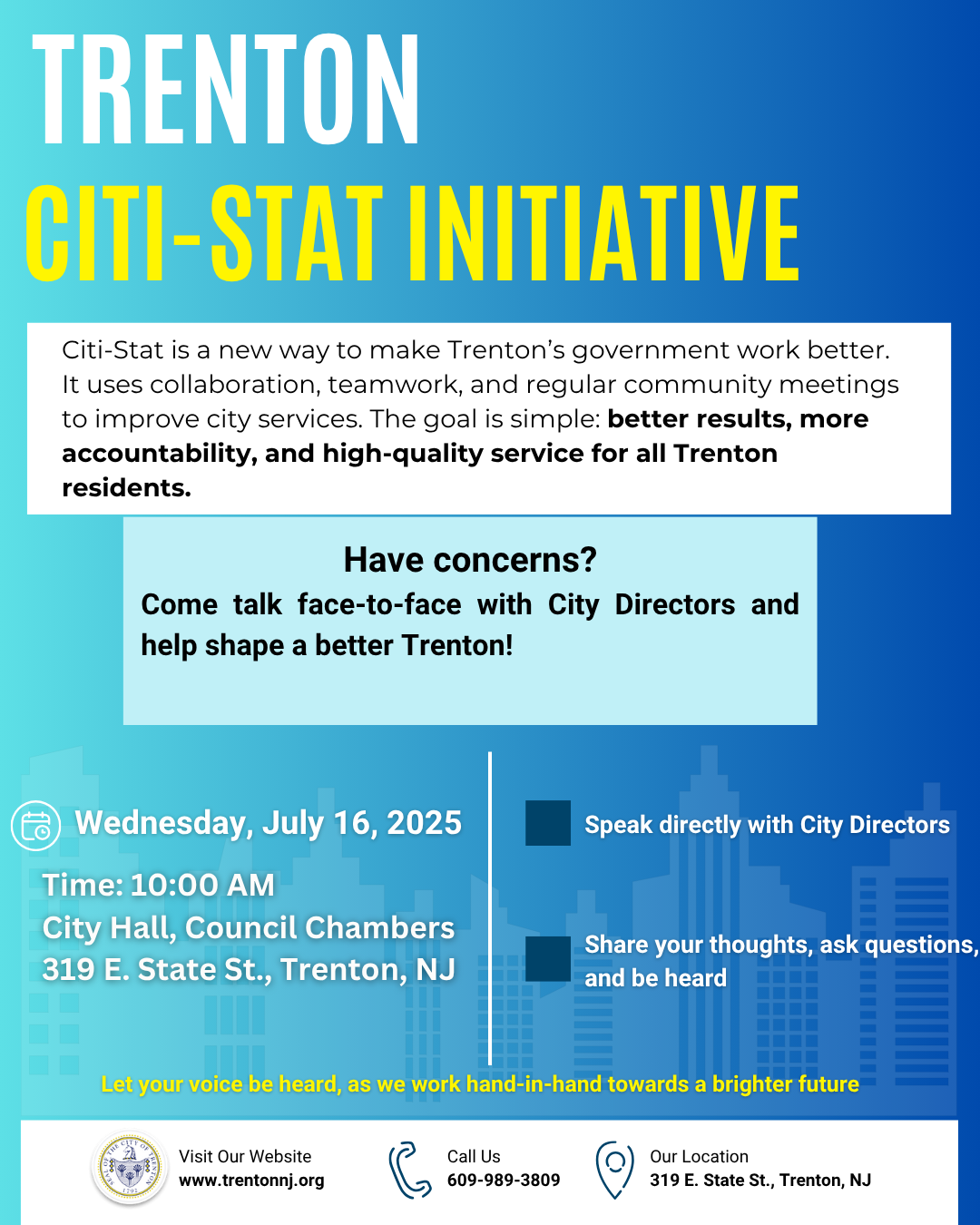 Trenton, N.J. – The City of Trenton will hold the next Trenton Citi-Stat meeting on Wednesday, July 16, 2025, at 10:00 a.m. The meeting will take place in the Council Chambers at Trenton City Hall, 319 East State Street, Trenton, NJ, and is open to all members of the public. As part of the city's commitment to accessibility, the meeting time varies each month to accommodate residents with different schedules.