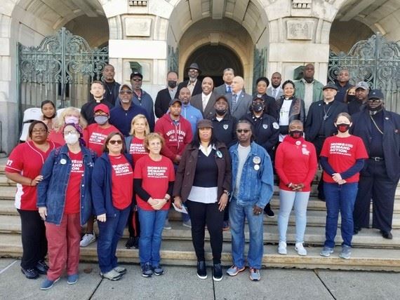Advocates and clergy outside City Hall