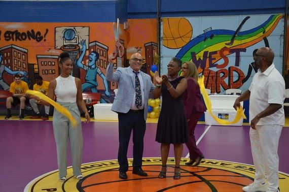 New amenities at the Center include; a teaching lab for media production, acting, t-shirt printing, a computer lab, a kitchen, new offices and restrooms, a laundry area, a new gym floor colored purple and gold in honor of the late Kobe Bryant, and new rims and nets for the basketball courts.